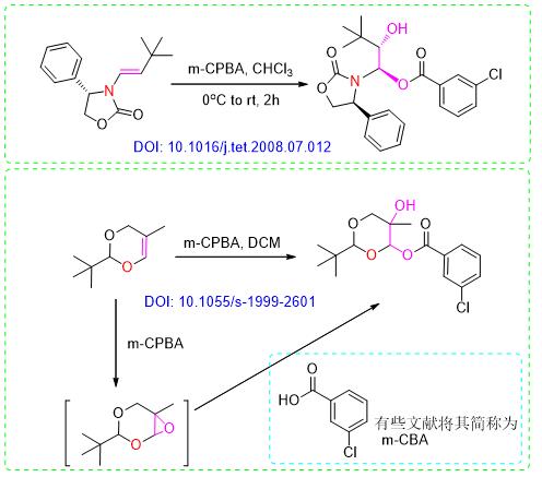 間氯過氧苯甲酸(m-CPBA)是一種良好的親電試劑。能和許多官能團發(fā)生反應(yīng),可以氧化烯烴、烯醇硅醚、呋喃、硫化物、硒化物和氨基化合物等。